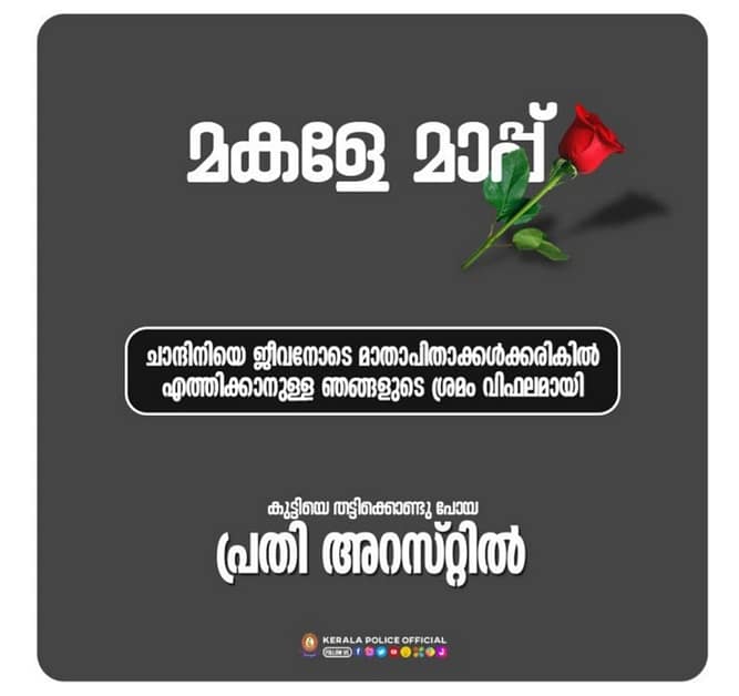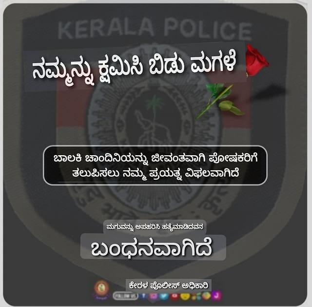 ಬಾಲಕಿ ನಾಪತ್ತೆಯಾದ ವಿಷಯ ತಿಳಿದ ಕೂಡಲೆ ಹುಡುಕಾಟಕ್ಕೆ ಮುಂದಾದ ಪೊಲೀಸರಿಗೆ ಸ್ಥಳೀಯ ರ ಸಹಕಾರ ಮತ್ತು ಸಿಸಿ ಟಿವಿ ಪುಟೆಜ್ ಅಧಾರದ ಮೇಲೆ ಮಗುವನ್ನು ಅಪಹರಿಸಿದವನನ್ನು ಬಂಧಿಸಿದ ನಂತರ ತಡರಾತ್ರಿ ಬಾಲಕಿಯ ಶವ ಪತ್ತೆಯಾಗಿದೆ. ಇದೀಗ ಆರೋಪಿಯನ್ನು ಪೊಲೀಸರು ಬಂಧಿಸಿದಾಗ ಕುಡಿದಮತ್ತಿನಲ್ಲಿದ್ದ ಆತನನ್ನು ವಿಚಾರಣೆ ಮಾಡಲು ಸಾಧ್ಯವಾಗದೆ ಮಾರನೆಯ ದಿನ ಮುಂಜಾನೆ ವಿಚಾರಣೆಗೆ ಒಳಪಡಿಸಿದಾಗ ಆತನೆ ಎಲ್ಲವನ್ನೂ ಹೇಳಿ ಬಾಕಿಯನ್ನು ಅತ್ಯಾಚಾರಮಾಡಿ ಹತ್ಯೆಮಾಡಿರುವುದಾಗಿ ಒಪ್ಪಿಕೊಂಡಿದ್ದಾನೆ. ಆರೋಪಿ ಮಗುವಿನ ಕುಟುಂಬ ವಾಸವಿದ್ದ ಕಟ್ಟಡದಲ್ಲೇ ವಾಸವಾಗಿದ್ದನಂತೆ ಪೊಲೀಸರ ಪ್ರಕಾರ, ಆರೋಪಿ ಕಟ್ಟಡದ ಮೊದಲ ಮಹಡಿಯಲ್ಲಿ ವಾಸಿಸುತ್ತಿದ್ದನಂತೆ.ಈ ಘಟನೆಗೆ ಕೇರಳ ರಾಜ್ಯದಾದ್ಯಂತ ಆಕ್ರೋಶ ವ್ಯಕ್ತವಾಗಿದ್ದು, ಇದೀಗ ಸ್ವತಃ ಕೇರಳ ಪೊಲೀಸರೇ ‘ಕ್ಷಮಿಸಿ ಮಗಳೇ’ ಎಂದು ಟ್ವೀಟ್ ನಲ್ಲಿ ಬರೆದುಕೊಂಡಿದ್ದಾರೆ. ಕೇರಳ ಪೊಲೀಸರು ಬಾಲಕಿಯ ಪೋಷಕರಿಗೆ ಕ್ಷಮೆಯಾಚನೆಯ ಪೋಸ್ಟ್ ಮಾಡಿದ್ದಾರೆ. “ಮಗುವನ್ನು ಸುರಕ್ಷಿತವಾಗಿ ಪೋಷಕರ ಬಳಿಗೆ ಕರೆತರುವ ನಮ್ಮ ಪ್ರಯತ್ನ ವಿಫಲವಾಗಿದೆ” ಎಂದು ಅವರು ಪೋಸ್ಟ್ನಲ್ಲಿ ಬರೆದಿದ್ದಾರೆ. ಮಗುವನ್ನು ಅಪಹರಿಸಿದ ಆರೋಪಿಯನ್ನು ಬಂಧಿಸಲಾಗಿದೆ ಎಂದು ಪೊಲೀಸರು ಪೋಸ್ಟ್ ಮೂಲಕ ತಿಳಿಸಿದ್ದಾರೆ.
