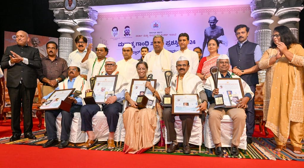 ಹಾವೇರಿ ಜಿಲ್ಲೆಯ ಹೊಸರಿತ್ತಿ ಗ್ರಾಮದ ಗುದ್ಲೆಪ್ಪ ಹಳ್ಳಿಕೇರಿ ಸ್ಮಾರಕ ಪ್ರತಿಷ್ಠಾನದ ಗಾಂಧಿ ಗ್ರಾಮೀಣ ಗುರುಕುಲ ವಸತಿ ಶಾಲೆ ಮತ್ತು ತುಮಕೂರು ಜಿಲ್ಲೆ ತುರುವೆ ಕೆರೆ ತಾಲ್ಲೂಕಿನ ಗೊಟ್ಟಿಕೆರೆಯ ಜಿ.ಬಿ. ಶಿವರಾಜು ಅವರಿಗೆ ಮಹಾತ್ಮ ಗಾಂಧಿ ಸೇವಾ ಪ್ರಶಸ್ತಿಗಳನ್ನು ಪ್ರದಾನ ಮಾಡಲಾಯಿತು.