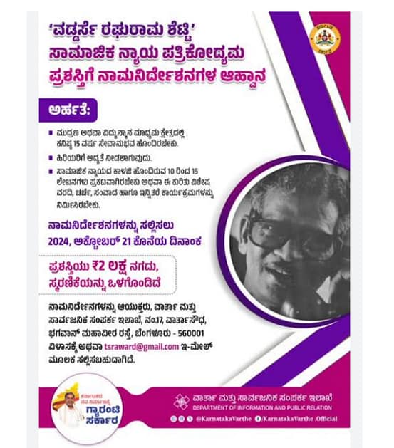 “ವಡ್ಡರ್ಸೆ ರಘುರಾಮ ಶೆಟ್ಟಿ” ಸಾಮಾಜಿಕ ನ್ಯಾಯ ಪತ್ರಿಕೋದ್ಯಮ ಪ್ರಶಸ್ತಿಗೆ ನಾಮನಿರ್ದೇಶನಗಳ ಆಹ್ವಾನ