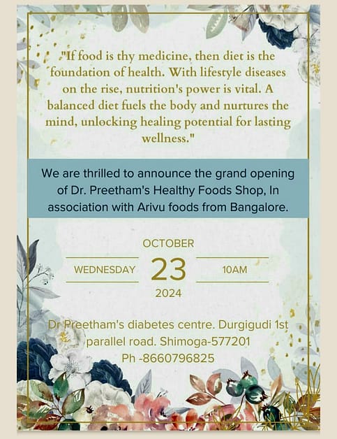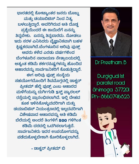 ಜೀವನ ಶೈಲಿಯನ್ನು ಉತ್ತಮ ಗೊಳಿಸಿಕೊಳ್ಳುವುದೊಂದೇ ಇದಕ್ಕೆ ಪರಿಹಾರ ಎಂಬುದು ಎಲ್ಲರಿಗೂ ತಿಳಿದಿರುವ ಸತ್ಯ . ನನ್ನ 18 ವರ್ಷಗಳ ಅನುಭವದಿಂದ ಹೇಳುವುದಾದರೆ ನಮ್ಮ ಆಹಾರ ಪದ್ಧತಿಯಲ್ಲಿ ಬದಲಾವಣೆ ಮಾಡುವುದು, ದೈಹಿಕ ಚಟುವಟಿಕೆಗಳನ್ನು ಉತ್ತಮಗೊಳಿಸಿಕೊಳ್ಳುವುದು ಹಾಗೂ ಒತ್ತಡ ರಹಿತ ಜೀವನವನ್ನು ರೂಡಿಸಿಕೊಳ್ಳುವುದು ಮಾತ್ರ ಇದಕ್ಕೆ ಪರಿಹಾರ. ಇದನ್ನೆಲ್ಲ ಗಮನದಲ್ಲಿಟ್ಟುಕೊಂಡು ಇದೆ ಅಕ್ಟೋಬರ್ 23 ನೇ ತಾರೀಕು ಬೆಳಗ್ಗೆ 10 ಗಂಟೆಗೆ ಡಾ. ಪ್ರೀತಮ್ಸ್ ಹೆಲ್ದಿ ಫುಡ್ಸ್ ಎಂಬ ಮಳಿಗೆಯನ್ನು ಬೆಂಗಳೂರಿನ ನುರಿತ ಆಹಾರ ತಯಾರಿಕರಾದ ಅರಿವು ಫುಡ್ಸ್ ಅವರ ಸಹಯೋಗದೊಂದಿಗೆ ಲೋಕಾರ್ಪಣೆ ಮಾಡುತ್ತಿದ್ದೇವೆ. ಇದರಲ್ಲಿ ನುರಿತ ವೈದ್ಯರು ಮತ್ತು ಆಹಾರ ತಜ್ಞರಿಂದ ಮಾರ್ಗದರ್ಶನ, ಆರೋಗ್ಯಕರ ಆಹಾರ ಮತ್ತು ಸಂಬಂಧಿಸಿದ ರಕ್ತಪರೀಕ್ಷೆಗಳನ್ನು ಮಾಡಿಸುವುದಾಗಿದೆ. ಅತ್ಯಂತ ಕಡಿಮೆ ವೆಚ್ಚದಲ್ಲಿ (Rs 240 for 1/2 kg )ಮಾಸಿಕ ಪ್ಯಾಕೇಜ್ ಗಳನ್ನು ಕೂಡ ಪರಿಚಯಿಸುತ್ತಿದ್ದೇವೆ. ತಾವುಗಳು ಸಮಯ ಮಾಡಿಕೊಂಡು ಬಂದು ಪ್ರಾರಂಭೋತ್ಸವದಲ್ಲಿ ಪಾಲ್ಗೊಳ್ಳಬೇಕೆಂದು ತಮ್ಮಲ್ಲಿ ಕೋರಿಕೊಳ್ಳುತ್ತೇವೆ. ತಮ್ಮ ಆಗಮನದ ನಿರೀಕ್ಷೆಯಲ್ಲಿ.