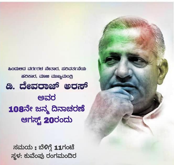 ಶಿವಮೊಗ್ಗ : ಜಿಲ್ಲಾಡಳಿತ, ಜಿಲ್ಲಾ ಪಂಚಾಯತ್ ಹಾಗೂ ಹಿಂದುಳಿದ ವರ್ಗಗಳ ಕಲ್ಯಾಣ ಇಲಾಖೆ, ಶಿವಮೊಗ್ಗ ಇವರ ಸಂಯುಕ್ತಾಶ್ರಯದಲ್ಲಿ ಪ್ರಗತಿಪರ ಸಾಧನೆಗಳ ಸರದಾರ-ಸಾಮಾಜಿಕ ಪರಿವರ್ತನೆಯ ಹರಿಕಾರ-ಕರ್ನಾಟಕ ರಾಜ್ಯದ ಮಾಜಿ ಮುಖ್ಯಮಂತ್ರಿಗಳಾದ ಡಿ.ದೇವರಾಜ ಅರಸುರವರ 108ನೇ ಜನ್ಮ ದಿನಾಚರಣೆಯನ್ನು