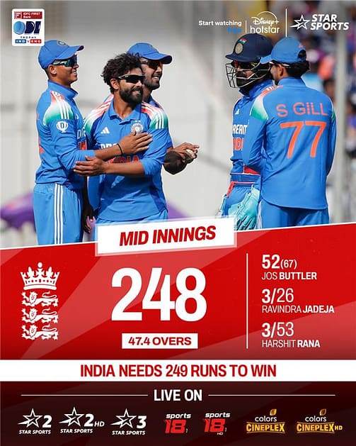ನಾಗ್ಪುರರದ ವಿದರ್ಭ ಕ್ರಿಕೆಟ್ ಸಂಸ್ಥೆ ಕ್ರೀಡಾಂಗಣದಲ್ಲಿ ಟಾಸ್ ಗೆದ್ದು ಮೊದಲು ಬ್ಯಾಟಿಂಗ್ ಮಾಡಿದ ಆಂಗ್ಲರ ಪಡೆ 47.4 ಓವರ್ಗಳಲ್ಲಿ 248 ರನ್ ಗಳಿಸಿ ಉತ್ತಮ ಮೊತ್ತ ಕಲೆಹಾಕಿ ಆಲೌಟ್ ಆಯಿತು.ಆಂಗ್ಲರು ಒಡ್ಡಿದ 248 ರನ್ ಗಳ ಗುರಿ ಬೆನ್ನತ್ತಿದ ಟೀಂ ಇಂಡಿಯಾದ ಆಟಗಾರರು ಇನ್ನೂ 68 ಎಸೆತಗಳು ಬಾಕಿ ಇರುವಂತೆಯೇ 6 ವಿಕೆಟ್ಗೆ 251 ರನ್ ಗಳಿಸಿ ವಿಜಯದ ಕಹಳೆ ಮೊಳಗಿಸಿದರು .