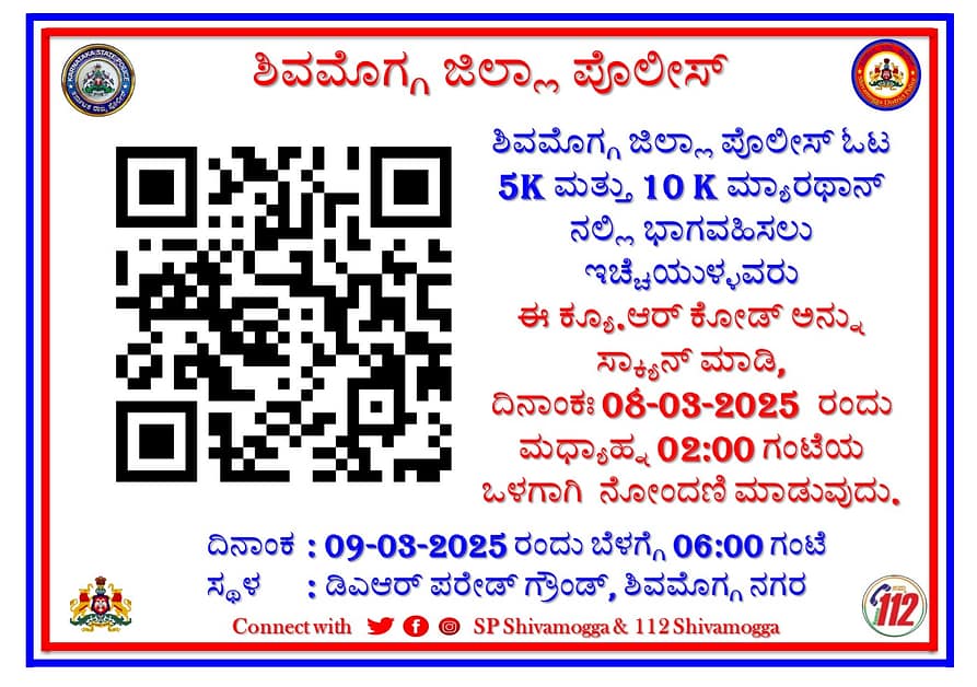 2ನೇ ಆವೃತ್ತಿಯ ಕರ್ನಾಟಕ ರಾಜ್ಯ ಪೊಲೀಸ್ ಓಟವನ್ನು “ನಮ್ಮ ಪೊಲೀಸ್ ನಮ್ಮ ಹೆಮ್ಮೆ,” “ಎಲ್ಲರಿಗಾಗಿ ಫಿಟ್ ನೆಸ್” ಮತ್ತು “ಮಾದಕ ದ್ರವ್ಯ ಮುಕ್ತ ಕರ್ನಾಟಕ” ಧ್ಯೇಯ ವಾಖ್ಯದೊಂದಿಗೆ ಶಿವಮೊಗ್ಗ ಜಿಲ್ಲಾ ಪೊಲೀಸ್ ವತಿಯಿಂದ ದಿನಾಂಕಃ 09-03-2025 ರಂದು ಬೆಳಗ್ಗೆ 06:00 ಗಂಟೆಗೆ ಶಿವಮೊಗ್ಗ ನಗರದಲ್ಲಿ ಮಹಿಳೆಯರು ಮತ್ತು ಪುರುಷರಿಗಾಗಿ 5K ಮತ್ತು ಪುರುಷರಿಗಾಗಿ 10 K ಮ್ಯಾರಥಾನ್ ಓಟವನ್ನು ಹಮ್ಮಿಕೊಂಡಿದ್ದು, 5K ಮ್ಯಾರಥಾನ್ ಓಟವನ್ನು ಡಿಎಆರ್ ಪೊಲೀಸ್ ಕವಾಯತು ಮೈದಾನದಿಂದ ಪ್ರಾರಂಭಿಸಿ, ಅಶೋಕ ವೃತ್ತದ ಮಾರ್ಗವಾಗಿ ಅಮೀರ್ ಅಹಮ್ಮದ್ ವೃತ್ತ, ಶಿವಪ್ಪ ನಾಯಕ ವೃತ್ತ, ಕರ್ನಾಟಕ ಸಂಘ ವೃತ್ತ, ಡಿವಿಎಸ್ ವೃತ್ತ, ಮಹಾವೀರ ವೃತ್ತ, ಶಿವಮೂರ್ತಿ ವೃತ್ತ, ಜೈಲ್ ವೃತ್ತ, ಐಬಿ ವೃತ್ತದ ಮುಖಾಂತರ ಡಿಎಆರ್ ಪೊಲೀಸ್ ಕವಾಯತು ಮೈದಾನಕ್ಕೆ ಬಂದು ಮುಕ್ತಾಯ ಮಾಡಲಾಗುದು. 10 K ಮ್ಯಾರಥಾನ್ ಓಟವನ್ನು ಇದೇ ಮಾರ್ಗದಲ್ಲಿ 2 ಸುತ್ತುಗಳು ಓಡಿ ಡಿಎಆರ್ ಪೊಲೀಸ್ ಕವಾಯತು ಮೈದಾನದಲ್ಲಿ ಮುಕ್ತಾಯ ಮಾಡಲಾಗುವುದು.