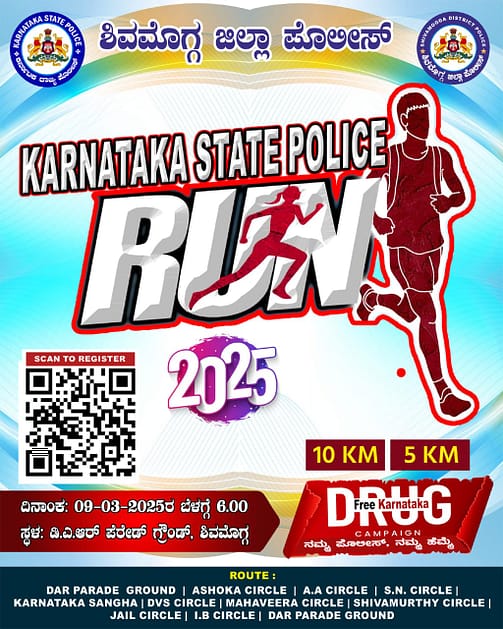 ಅಶ್ವಸೂರ್ಯ/ಶಿವಮೊಗ್ಗ: ಕರ್ನಾಟಕ ರಾಜ್ಯ ಪೊಲೀಸ್ ಓಟ – 2024 ರ ಯಶಸ್ಸಿನ ಹಿನ್ನೆಲೆಯಲ್ಲಿ , ಶಿವಮೊಗ್ಗ ಜಿಲ್ಲಾ ಪೋಲಿಸ್ ಅಧೀಕ್ಷಕರಾದ ಮಿಥುನ್ ಕುಮಾರ್ ಜಿ ಕೆ ಐಪಿಎಸ್ ಅವರ ಸಾರಥ್ಯದಲ್ಲಿ 2ನೇ ಆವೃತ್ತಿಯ ಕರ್ನಾಟಕ ರಾಜ್ಯ ಪೊಲೀಸ್ ಓಟವನ್ನು “ನಮ್ಮ ಪೊಲೀಸ್ ನಮ್ಮ ಹೆಮ್ಮೆ,” “ಎಲ್ಲರಿಗಾಗಿ ಫಿಟ್ ನೆಸ್” ಮತ್ತು “ಮಾದಕ ದ್ರವ್ಯ ಮುಕ್ತ ಕರ್ನಾಟಕ” ಧೈಯ ವಾಖ್ಯದೊಂದಿಗೆ ಶಿವಮೊಗ್ಗ ಜಿಲ್ಲಾ ಪೊಲೀಸ್ ವತಿಯಿಂದ ದಿನಾಂಕಃ 09-03-2025 ರಂದು ಬೆಳಿಗ್ಗೆ 6 ಗಂಟೆಗೆ ಶಿವಮೊಗ್ಗ ನಗರದಲ್ಲಿ ಮಹಿಳೆಯರು ಮತ್ತು ಪುರುಷರಿಗಾಗಿ 5K ಮತ್ತು ಪುರುಷರಿಗಾಗಿ 10 K ಮ್ಯಾರಥಾನ್ ಓಟವನ್ನು ಹಮ್ಮಿಕೊಂಡಿದ್ದು, 5K ಮ್ಯಾರಥಾನ್ ಓಟವನ್ನು ಡಿಎಆರ್ ಪೊಲೀಸ್ ಕವಾಯತು ಮೈದಾನದಿಂದ ಪ್ರಾರಂಭಿಸಿ, ಅಶೋಕ ವೃತ್ತದ ಮಾರ್ಗವಾಗಿ ಅಮೀರ್ ಅಹಮ್ಮದ್ ವೃತ್ತ, ಶಿವಪ್ಪ ನಾಯಕ ವೃತ್ತ, ಕರ್ನಾಟಕ ಸಂಘ ವೃತ್ತ, ಡಿವಿಎಸ್ ವೃತ್ತ, ಮಹಾವೀರ ವೃತ್ತ, ಶಿವಮೂರ್ತಿ ವೃತ್ತ, ಜೈಲ್ ವೃತ್ತ, ಐಬಿ ವೃತ್ತದ ಮುಖಾಂತರ ಡಿಎಆರ್ ಪೊಲೀಸ್ ಕವಾಯತು ಮೈದಾನಕ್ಕೆ ಬಂದು ಮುಕ್ತಾಯ ಮಾಡಲಾಗುದು.