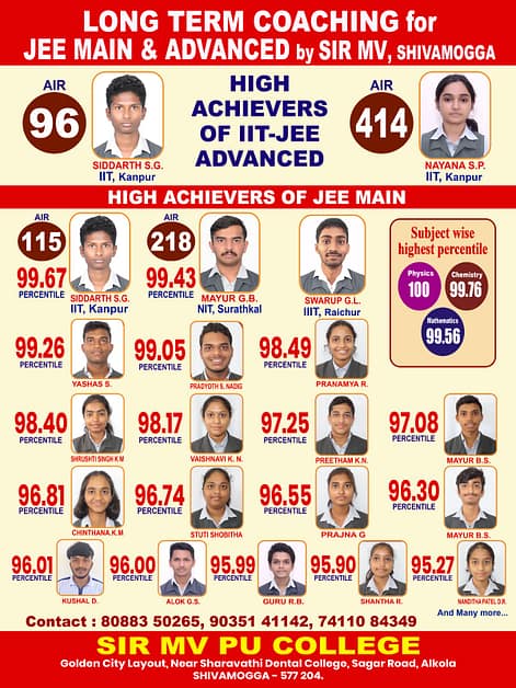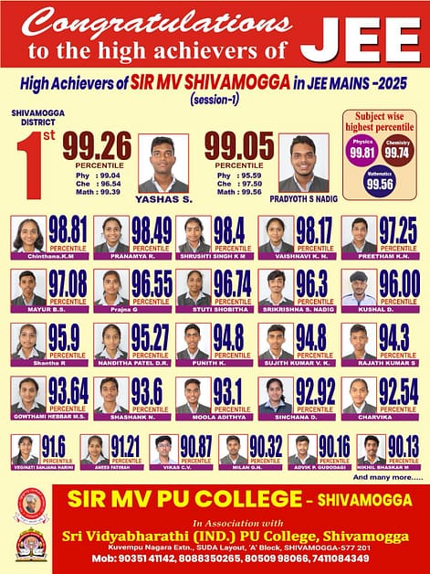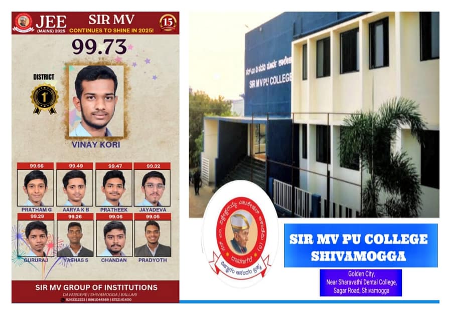ಶಿವಮೊಗ್ಗ: ಮಲೆನಾಡಿನ ಪ್ರತಿಷ್ಠಿತ ಸರ್ ಎಂವಿ ಪಿಯು ಕಾಲೇಜ್ ವಿಧ್ಯಾರ್ಥಿಗಳ ಭವಿಷ್ಯ ರೂಪಿಸುವ ಕೇಂದ್ರವಾಗಿದೆ.