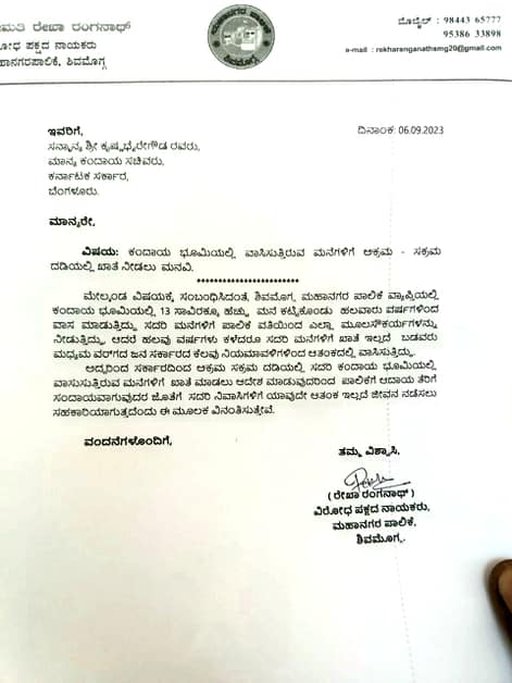 ಶಿವಮೊಗ್ಗ ಮಹಾನಗರ ಪಾಲಿಕೆ ವ್ಯಾಪ್ತಿಯಲ್ಲಿ ಕಂದಾಯ ಭೂಮಿಯಲ್ಲಿ 13 ಸಾವಿರಕ್ಕೂ ಹೆಚ್ಚು ಬಡ ಕುಟುಂಬಗಳು ಮನೆ ಕಟ್ಟಿಕೊಂಡು ಹಲವಾರು ವರ್ಷಗಳಿಂದ ಬದುಕು ದೂಡುತ್ತಿದ್ದಾರೆ. ಸದರಿ ಮನೆಗಳಿಗೆ ಪಾಲಿಕೆ ವತಿಯಿಂದ ಎಲ್ಲಾ ಮೂಲಸೌಕರ್ಯಗಳನ್ನು ಒದಗಿಸಿಕೊಡಲಾಗಿದೆ. ಆದರೆ ಹಲವು ವರ್ಷಗಳು ಕಳೆದರೂ ಸದರಿ ಮನೆಗಳಿಗೆ ಖಾತೆ ಇಲ್ಲದೆ ಬಡವರು ಮಧ್ಯಮ ವರ್ಗದ ಜನ ಸರ್ಕಾರದ ಕೆಲವು ನಿಯಮಾವಳಿಗಳಿಂದ ಆತಂಕದಲ್ಲಿ ವಾಸಿಸುವಂತಾಗಿದೆ. ಅದ್ದರಿಂದ ಸರ್ಕಾರದಿಂದ ಅಕ್ರಮ ಸಕ್ರಮ ದಡಿಯಲ್ಲಿ ಸದರಿ ಕಂದಾಯ ಭೂಮಿಯಲ್ಲಿ ವಾಸುಸುತ್ತಿರುವ ಮನೆಗಳಿಗೆ ಖಾತೆ ಮಾಡಲು ಆದೇಶ ಮಾಡುವುದರಿಂದ ಪಾಲಿಕೆಗೆ ಆದಾಯ ತೆರಿಗೆ ಸಂದಾಯವಾಗುವುದರ ಜೊತೆಗೆ ಸದರಿ ನಿವಾಸಿಗಳಿಗೆ ಯಾವುದೇ ಆತಂಕ ಇಲ್ಲದೆ ಜೀವನ ನಡೆಸಲು ಸಹಕಾರಿಯಾಗುತ್ತದೆಂದು ಈ ಮೂಲಕ ವಿನಂತಿಸುತ್ತೇವೆ ಎಂದು