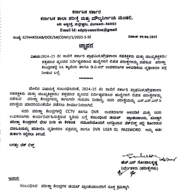 ವಿಷಯ:2024-25 ನೇ ಸಾಲಿಗೆ ಸರ್ಕಾರಿ ಪ್ರಾಥಮಿಕ/ಪ್ರೌಢಶಾಲಾ ಸಹಶಿಕ್ಷಕರು ಮತ್ತು ಮುಖ್ಯಶಿಕ್ಷಕರು/ತತ್ಸಮಾನ ವೃಂದದ ನಿರ್ದಿಷ್ಟಪಡಿಸಿದ ಹುದ್ದೆಗಳಿಗೆ ಲಿಖಿತ ಪರೀಕ್ಷೆಗಳನ್ನು ನಡೆಸುವ ಪರೀಕ್ಷಾ ಕೇಂದ್ರಗಳಲ್ಲಿ ಸಿಸಿ ಕ್ಯಾಮೆರಾ ಹಾಗೂ ಡಿ.ವಿ.ಆರ್ ಉಪಕರಣಗಳ ಅಳವಡಿಕೆಯ ದೃಢೀಕರಣ ಪತ್ರ ನೀಡಲಾಗಿದೆ.