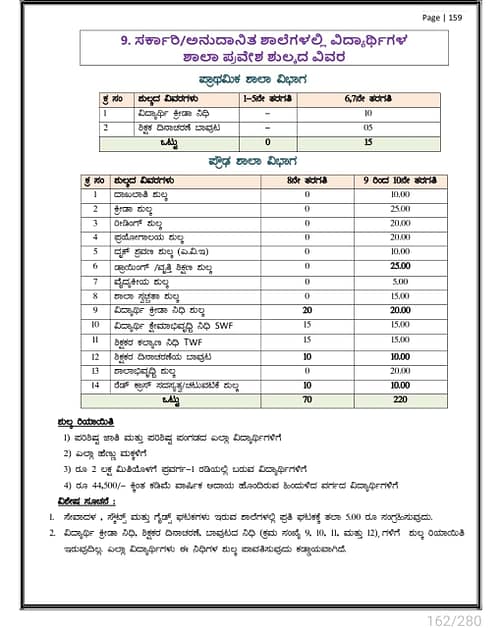 ಪ್ರೌಢ ಶಾಲಾ ವಿಭಾಗ: 8ನೇ ತರಗತಿ ಒಟ್ಟು 70 ರೂ., 9-10ನೇ ತರಗತಿ ಒಟ್ಟು 220 ರೂ.ಗಳು. ಇವುಗಳಲ್ಲಿ ದಾಖಲಾತಿ ಶುಲ್ಕ 8ನೇ ತರಗತಿ 0, 9-10ನೇ ತರಗತಿ 10 ರೂ.ಗಳು. ಕ್ರೀಡಾ ಶುಲ್ಕ 8ನೇ ತಗರತಿ 0, 9-10ನೇ ತರಗತಿ 25 ರೂ.ಗಳು. ರೀಡಿಂಗ್ ಶುಲ್ಕ 8ನೇ ತರಗತಿ, 9-10ನೇ ತರಗತಿ 20 ರೂ.ಗಳು., ಪ್ರಯೋಗಾಲಯ ಶುಲ್ಕ 8ನೇ ತರಗತಿ 0, 9-10 20 ರೂ.ಗಳು. ದೃಕ್ ಶ್ರವಣ ಶುಲ್ಕ (ಎ. ವಿ. ಇ) 8ನೇ ತರಗತಿ 0, 9-10ನೇ ತರಗತಿ 10 ರೂ., ಡ್ರಾಯಿಂಗ್/ ವೃತ್ತಿ ಶಿಕ್ಷಣ ಶುಲ್ಕ 8ನೇ ತರಗತಿ 0, 9-10ನೇ ತರಗತಿ 25 ರೂ., ವೈದ್ಯಕೀಯ ಶುಲ್ಕ 8ನೇ ತರಗತಿ 0, 9-10ನೇ ತರಗತಿ 5 ರೂ.ಗಳು. ಶಾಲಾ ಸ್ವಚ್ಛತಾ ಶುಲ್ಕ 8ನೇ ತರಗತಿ 0, 9-10 15 ರೂ.ಗಳು. ವಿದ್ಯಾರ್ಥಿ ಕ್ರೀಡಾ ನಿಧಿ 8ನೇ ತರಗತಿ 20 ರೂ., 9-102 33 20 ರೂ.ಗಳು. ವಿದ್ಯಾರ್ಥಿ ಕ್ಷೇಮಾಭಿವೃದ್ಧಿ ನಿಧಿ 8ನೇ ತರಗತಿ 15, 9-10 15 ರೂ. ಗಳು. ಶಿಕ್ಷಕರ ಕಲ್ಯಾಣ ನಿಧಿ 8ನೇ ತರಗತಿ 15 ರೂ., 9-1015 ರೂ.ಗಳು. ಶಿಕ್ಷಕರ ದಿನಾಚರಣೆಯ ಬಾವುಟ 8ನೇ ತರಗತಿ 10 ರೂ., 9-1010 ರೂ.ಗಳು. ಶಾಲಾಭಿವೃದ್ಧಿ ಶುಲ್ಕ 8ನೇ ತರಗತಿ 0, 9-10 20 ರೂ.ಗಳು. ರೆಡ್ ಕ್ರಾಸ್ ಸದಸ್ಯತ್ವ/ ಚಟುವಟಿಕೆ ಶುಲ್ಕ 8ನೇ 383 10, 9-10 10 ರೂಗಳು