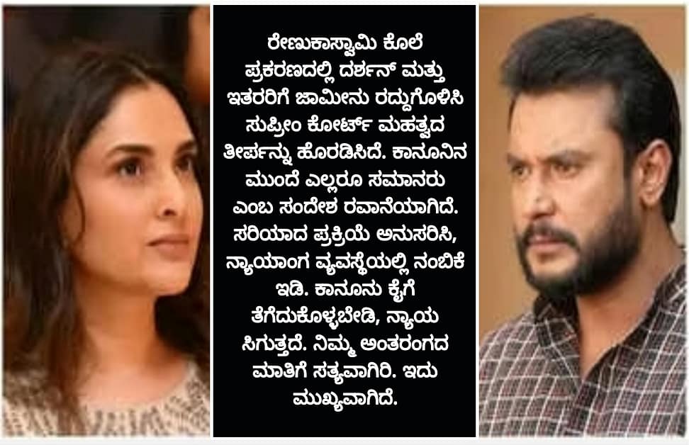 ರೇಣುಕಾಸ್ವಾಮಿ ಕೊಲೆ ಪ್ರಕರಣದಲ್ಲಿ ದರ್ಶನ್ ಮತ್ತು ಇತರರಿಗೆ ಜಾಮೀನು ರದ್ದುಗೊಳಿಸಿ ಸುಪ್ರೀಂ ಕೋರ್ಟ್ ಮಹತ್ವದ ತೀರ್ಪನ್ನು ಹೊರಡಿಸಿದೆ. ಕಾನೂನಿನ ಮುಂದೆ ಎಲ್ಲರೂ ಸಮಾನರು ಎಂಬ ಸಂದೇಶ ರವಾನೆಯಾಗಿದೆ. ಸರಿಯಾದ ಪ್ರಕ್ರಿಯೆ ಅನುಸರಿಸಿ, ನ್ಯಾಯಾಂಗ ವ್ಯವಸ್ಥೆಯಲ್ಲಿ ನಂಬಿಕೆ ಇಡಿ. ಕಾನೂನು ಕೈಗೆ ತೆಗೆದುಕೊಳ್ಳಬೇಡಿ, ನ್ಯಾಯ ಸಿಗುತ್ತದೆ. ನಿಮ್ಮ ಅಂತರಂಗದ ಮಾತಿಗೆ ಸತ್ಯವಾಗಿರಿ. ಇದು ಮುಖ್ಯವಾಗಿದೆ.