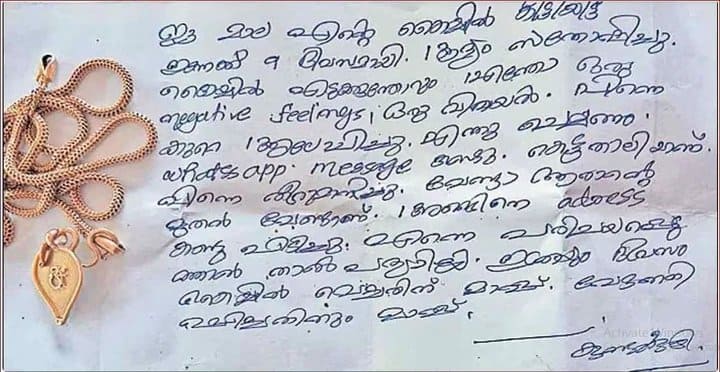 ಪೊಲೀಸರು ಮನೆಯಿಂದ ಚಿನ್ನದ ಮಾಂಗಲ್ಯ ಸರ ಕಾಣೆಯಾಗಿದೆ ಎಂಬುದಾಗಿ ವಿವರಗಳೊಂದಿಗೆ ಸ್ಥಳೀಯ ವಾಟ್ಸಾಪ್ ಗ್ರೂಪ್ ಗಳಲ್ಲಿ ಮಾಹಿತಿ ಹಾಕಿದ್ದರು. ಆಗಸ್ಟ್ 13 ರಂದು ಬೆಳಗ್ಗೆ 10.30 ರ ವೇಳೆಗೆ ಗೀತಾ ಮತ್ತು ದಾಮೋದರನ್ ದಂಪತಿ ಪೊಯಿನಾಚಿ ಪೇಟೆಗೆ ತೆರಳಲು ಸಿದ್ಧತೆ ನಡೆಸುತ್ತಿದ್ದಾಗ, ತಮ್ಮ ಮನೆಯ ವರಾಂಡಾದಲ್ಲಿ ಅಚ್ಚುಕಟ್ಟಾಗಿ ಇರಿಸಿದ್ದ ತಮ್ಮ ಕಳೆದು ಹೋದ ಚಿನ್ನದ ಮಾಂಗಲ್ಯ ಸರ ಮತ್ತು ಮಲಯಾಳ ಭಾಷೆಯಲ್ಲಿ ಕೈ ಬರಹದಲ್ಲಿ ಬರೆದಿರುವ ಪತ್ರವೊಂದು ಕಾಣಿಸಿದೆ.