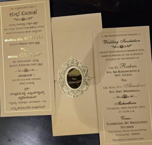 ಕನ್ನಡದ ಖ್ಯಾತ ನಿರೂಪಕಿ ಅನುಶ್ರೀ ಅವರು ದಾಂಪತ್ಯ ಜೀವನಕ್ಕೆ ಕಾಲಿಡಲು ಅಣಿಯಾಗಿದ್ದಾರೆ. ಈ ಬಗ್ಗೆ ಕೆಲವೇ ದಿನಗಳ ಹಿಂದೆ ಸುದ್ದಿ ಹೊರಬಿದ್ದಿತ್ತು. ಕೊಡಗು ಮೂಲದ ರೋಷನ್ ಜೊತೆ ಆ್ಯಂಕರ್ ಅನುಶ್ರೀ ಅವರು ಹಸೆಮಣೆ ಏರಲಿದ್ದಾರೆ. ಮದುವೆಗೆ ದಿನಾಂಕ ಕೂಡ ನಿಗದಿ ಆಗಿದೆ. ಆಗಸ್ಟ್ 28ರಂದು ಅನುಶ್ರೀ ಮತ್ತು ರೋಷನ್ ಅವರ ಮದುವೆ ನಡೆಯಲಿದೆ. ಈಗಾಗಲೇ ಆಪ್ತರಿಗೆ ಮದುವೆ ಆಮಂತ್ರಣ ಪತ್ರಿಕೆ ತಲುಪಿದೆ. ಅನುಶ್ರೀ ಮದುವೆಯ ಆಹ್ವಾನ ಪತ್ರಿಕೆ ತುಂಬಾ ಸರಳವಾಗಿದೆ. ಬರೆದ ಒಂದೆರಡು ಸಾಲುಗಳು ವಿಷೇಶವಾಗಿದೆ.