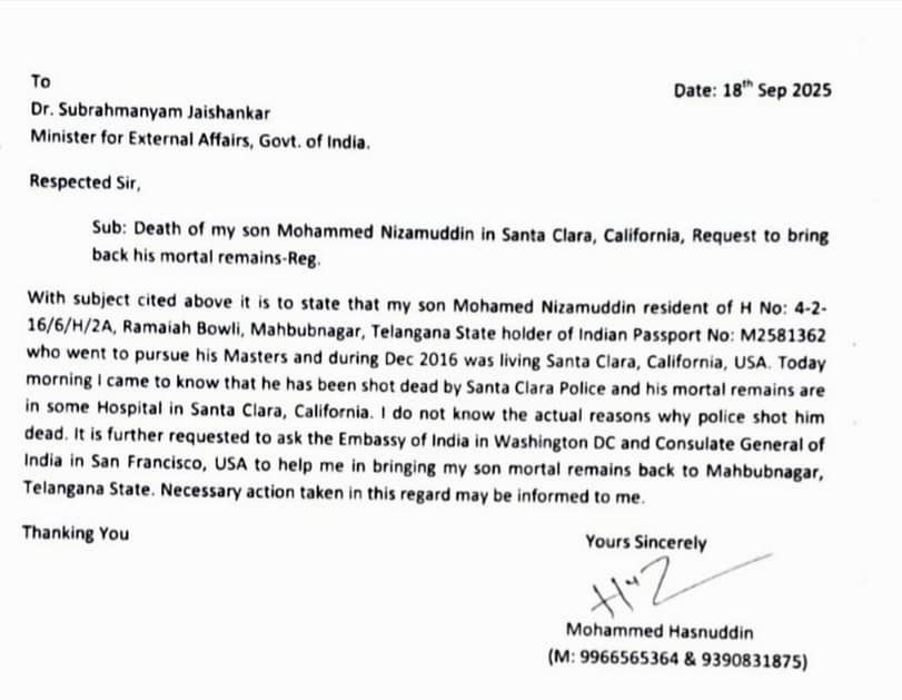 ನಿಜಾಮುದ್ದೀನ್ ತಂದೆ ಹಸ್ನುದ್ದೀನ್ ಪ್ರಕಾರ, ರೂಮ್ ಮೇಟ್ ನೊಂದಿಗಿನ ಘರ್ಷಣೆಯು ಒಂದು ಸಣ್ಣ ವಿಷಯಕ್ಕೆ ಸಂಬಂಧಿಸಿದ್ದಾಗಿತ್ತು. ಗುರುವಾರ ಬೆಳಿಗ್ಗೆಯಷ್ಟೇ ಗುಂಡಿನ ದಾಳಿಯ ಬಗ್ಗೆ ತನಗೆ ತಿಳಿಸಲಾಯಿತು ಎಂದು ಅವರು ಹೇಳಿದರು. ವಿದೇಶಾಂಗ ಸಚಿವ ಎಸ್. ಜೈಶಂಕರ್ ಅವರಿಗೆ ಬರೆದ ಪತ್ರದಲ್ಲಿ, ಹಸ್ನುದ್ದೀನ್ ತಮ್ಮ ಮಗನ ಶವವನ್ನು ಮೆಹಬೂಬ್ ನಗರಕ್ಕೆ ತರಲು ಸಹಾಯವನ್ನು ಕೋರಿದ್ದಾರೆ. “ಪೊಲೀಸರು ಅವನನ್ನು ಗುಂಡಿಕ್ಕಿ ಕೊಂದಿದ್ದಕ್ಕೆ ನಿಜವಾದ ಕಾರಣಗಳು ನನಗೆ ತಿಳಿದಿಲ್ಲ” ಎಂದು ಅವರು ವಾಷಿಂಗ್ಟನ್ ಮತ್ತು ಸ್ಯಾನ್ ಫ್ರಾನ್ಸಿಸ್ಕೋದಲ್ಲಿರುವ ಭಾರತೀಯ ಅಧಿಕಾರಿಗಳಿಂದ ತುರ್ತು ಸಹಾಯವನ್ನು ಕೋರುತ್ತಾ ಪತ್ರ ಬರೆದಿದ್ದಾರೆ.