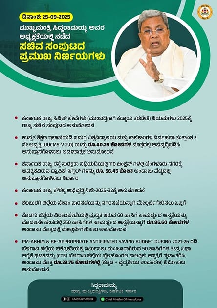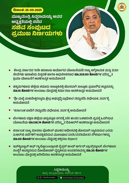ಅಶ್ವಸೂರ್ಯ/ಬೆಂಗಳೂರು : ಮುಖ್ಯಮಂತ್ರಿ ಸಿದ್ದರಾಮಯ್ಯ ಅವರ ಅಧ್ಯಕ್ಷತೆಯಲ್ಲಿ (ಸೆ,25) ನಡೆದ ಸಚಿವ ಸಂಪುಟದ ಸಭೆಯಲ್ಲಿ ಮಹತ್ವದ ನಿರ್ಣಯಗಳನ್ನು ಕೈಗೊಳ್ಳಲಾಯಿತು.