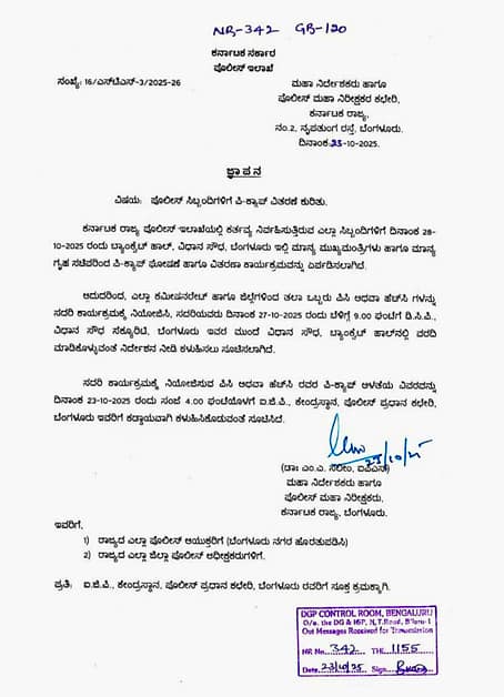 ಆದುದರಿಂದ, ಎಲ್ಲಾ ಕಮೀಷನರೇಟ್ ಹಾಗೂ ಜಿಲ್ಲೆಗಳಿಂದ ತಲಾ ಒಬ್ಬರು ಪಿಸಿ ಅಥವಾ ಹೆಚ್ಸಿ ಗಳನ್ನು ಸದರಿ ಕಾರ್ಯಕ್ರಮಕ್ಕೆ ನಿಯೋಜಿಸಿ, ಸದರಿಯವರು ದಿನಾಂಕ 27-10-2025 ರಂದು ಬೆಳಿಗ್ಗೆ 9.00 ಘಂಟೆಗೆ ಡಿ.ಸಿ.ಪಿ., ವಿಧಾನ ಸೌಧ ಸೆಕ್ಯೂರಿಟಿ, ಬೆಂಗಳೂರು ಇವರ ಮುಂದೆ ವಿಧಾನ ಸೌಧ, ಬ್ಯಾಂಗ್ಲೆಟ್ ಹಾಲ್ನಲ್ಲಿ ವರದಿ ಮಾಡಿಕೊಳ್ಳುವಂತೆ ನಿರ್ದೇಶನ ನೀಡಿ ಕಳುಹಿಸಲು ಸೂಚಿಸಲಾಗಿದೆ.