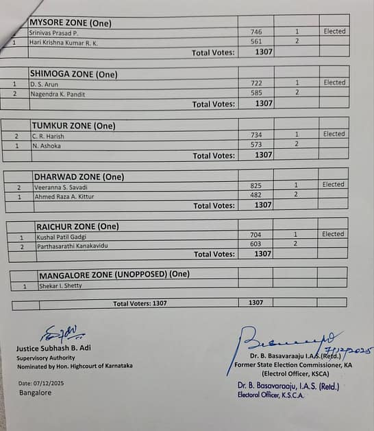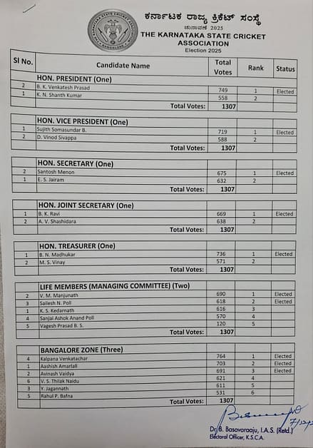ಬೆಂಗಳೂರು : ಕರ್ನಾಟಕ ರಾಜ್ಯ ಕ್ರಿಕೆಟ್ ಸಂಸ್ಥೆಯ ಚುನಾವಣಾ ಫಲಿತಾಂಶ ಪ್ರಕಟ. ವೆಂಕಟೇಶ್ ಪ್ರಸಾದ್ ಅಧ್ಯಕ್ಷರಾಗಿ ಅಯ್ಕೆ.