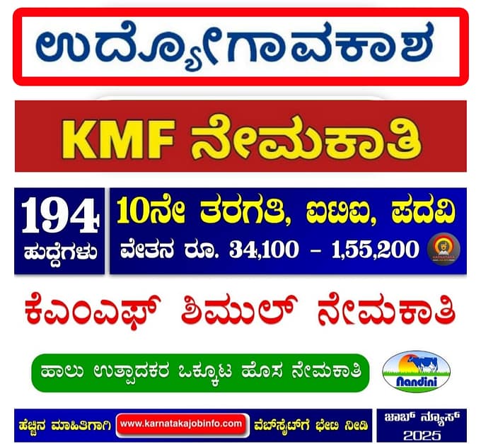ಕೆ.ಎಂ.ಎಫ್ ನೇಮಕಾತಿ : ಸಹಕಾರಿ ಹಾಲು ಉತ್ಪಾದಕರ ಸಂಘದಲ್ಲಿ 194 ಹುದ್ದೆಗಳ ಭರ್ತಿಗೆ ನೇಮಕಾತಿ ನಡೆಯಲಿದೆ.