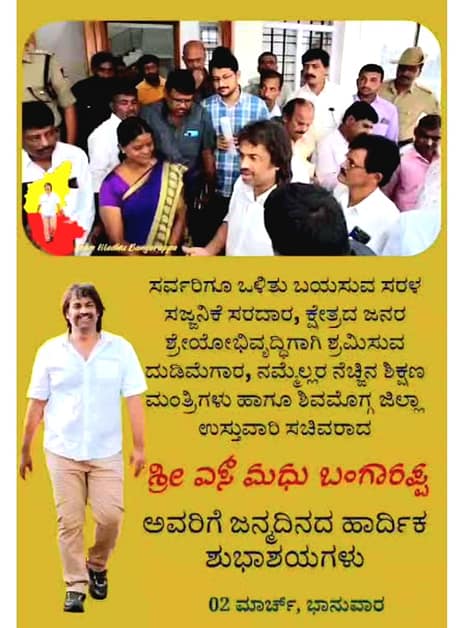 ತಂದೆ ಬಂಗಾರಪ್ಪ ಅವರ ಆದರ್ಶಗಳನ್ನೆ ಮೈಗೂಡಿಸಿಕೊಂಡು ರಾಜಕೀಯಕ್ಕೆ ಬಂದ ಮಧು ಬಂಗಾರಪ್ಪ ಅವರು, ತಮ್ಮ ತಂದೆಯಂತೆಯೇ ಆಗಬೇಕೆನ್ನುವುದಕ್ಕಿಂತ ಅವರ ಆದರ್ಶಗಳನ್ನೇ ಮೈಗೂಡಿಸಿಕೊಂಡು ಜನ ಸೇವೆಗೆ ಅರ್ಪಿಸಿಕೊಂಡಿದ್ದಾರೆ. ಸೊರಬದ ಜನರಿಗೆ ಅವರು ಶಾಸಕರು, ಅದರಾಚೆ ಜಿಲ್ಲೆಗೆ, ರಾಜ್ಯಕ್ಕವರು ಶಿಕ್ಷಣ ಸಚಿವರು. ಎರಡನ್ನು ಸಮತೂಕದಲ್ಲಿ ನಿಭಾಯಿಸಿಕೊಂಡೆ ಸೊರಬ ಕ್ಷೇತ್ರದ ಜನರ ಮನಗೆದ್ದಿರುವ ಅವರು, ತಂದೆ ಬಂಗಾರಪ್ಪನವರ ಹಾಗೆಯೇ ಸೊರಬದಲ್ಲಿ ಅಭಿವೃದ್ದಿಯ ಹರಿಕಾರ ಎನ್ನುವ ಹೆಗ್ಗಳಿಕೆಗೆ ಪಾತ್ರರಾಗಿದ್ದಾರೆ. ಶಾಸಕ ಮತ್ತು ಸಚಿವ ಸ್ಥಾನದ ಎರಡು ಜವಾಬ್ದಾರಿ ಹೊತ್ತುಕೊಂಡ ಈ ಎರಡೂವರೆ ವರ್ಷದ ಅವಧಿಯಲ್ಲಿ ಸೊರಬ ಕ್ಷೇತ್ರವೂ ಸೇರಿ ಜಿಲ್ಲೆಯಲ್ಲಿನ ಅನೇಕ ಮಹತ್ತರ ಅಭಿವೃದ್ದಿ ಯೋಜನೆಗಳ ಮೂಲಕ ತಮ್ಮದೇ ಛಾಪು ಮೂಡಿಸಿದ್ದಾರೆ. ಪಂಚ ಗ್ಯಾರೆಂಟಿ ಯೋಜನೆಗಳ ಮೂಲಕ ಇವತ್ತು ಲಕ್ಷಾಂತರ ಕುಟುಂಬಗಳಲ್ಲಿ ನೆಮ್ಮದಿ ಬದುಕು ಕಾಣುವುದಕ್ಕೆ ಅವರ ಪಾತ್ರವೂ ಪ್ರಮುಖ.