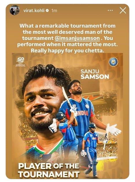 ತನ್ನದೇ ದಾಖಲೆಯನ್ನು ಸ್ಯಾಮ್ಸನ್ ಮುರಿದಿದ್ದರೂ, ವಿರಾಟ್ ಕೊಹ್ಲಿ ಇನ್ಸ್ಟಾಗ್ರಾಮ್ ಖಾತೆಯಲ್ಲಿ ಭಾವನಾತ್ಮಕ ಸಂದೇಶವನ್ನು ಸಂಜುಗೆ ತಮ್ಮ ಇನ್ಸ್ಟಾಗ್ರಾಮ್