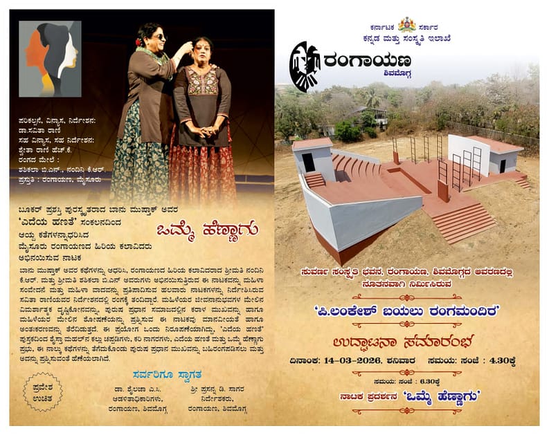 ಶಿವಮೊಗ್ಗ : ಸುವರ್ಣ ಸಂಸ್ಕೃತಿ ಭವನ ಆವರಣದಲ್ಲಿ ನಿರ್ಮಿಸಿರುವ ಪಿ.ಲಂಕೇಶ್ ಬಯಲು ರಂಗಮಂದಿರ ಉದ್ಘಾಟನೆ ಹಾಗೂ ಒಮ್ಮೆ ಹೆಣ್ಣಾಗು ನಾಟಕ ಪ್ರದರ್ಶನ.