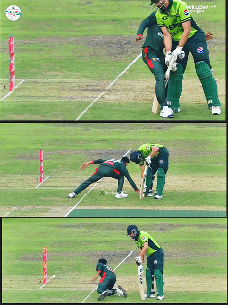 ಪಂದ್ಯದ 39 ನೇ ಓವರ್ನಲ್ಲಿ ಮೆಹದಿ ಹಸನ್ ಮಿರಾಜ್ ಬೌಲಿಂಗ್ ಮಾಡಲು ಬಂದರು. ಸ್ಟ್ರೈಕ್ನಲ್ಲಿ ಇದ್ದ ಮೊಹಮ್ಮದ್ ರಿಜ್ವಾನ್ ಚೆಂಡನ್ನು ಬೌಲರ್ನ ಬಲಭಾಗಕ್ಕೆ ಫ್ಲಿಕ್ ಮಾಡಿದರು ಮತ್ತು ಮಿರಾಜ್ ಚೆಂಡನ್ನು ತನ್ನ ಕಾಲಿನಿಂದ ನಿಲ್ಲಿಸಿದರು. ನಾನ್-ಸ್ಟ್ರೈಕರ್ನ ತುದಿಯಲ್ಲಿದ್ದ ಆಘಾ ಕ್ರೀಸ್ನಿಂದ ಹೊರಗಿದ್ದರು. ಇದರ ನಡುವೆ ಮಿರಾಜ್ ಮತ್ತು ಆಘಾ ಡಿಕ್ಕಿ ಹೊಡೆದರು.