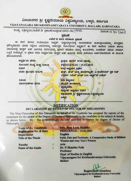 ಶಿವಮೊಗ್ಗ/ಬಳ್ಳಾರಿ : ಬಳ್ಳಾರಿಯ ವಿಜಯನಗರ ಶ್ರೀ ಕೃಷ್ಣದೇವರಾಯ ವಿಶ್ವವಿದ್ಯಾಲಯದ ಆಂಗ್ಲ ಅಧ್ಯಯನದ ವಿಭಾಗದ ಪ್ರಾಧ್ಯಪಕರಾದ