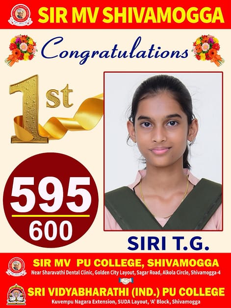 ಹಾಗೂ ಶಿವಮೊಗ್ಗದ ಸರ್ ಎಂ.ವಿ ಸಮೂಹ ಸಂಸ್ಥೆಯ ಜಿ. ವಿ ನಮ್ರತಾ 589, ಇಬ್ಬನಿ ಬಿ. ಜಿ 588, ಅವನಿ’ ಎನ್. ರಾವ್ 588, ಸಾಹಿತ್ಯ ಎಸ್. ಯು 588, ವಿಧಾತ್ರಿ ಆರ್ ಭೈರಿ 587, ಶಗುನ್ ವಿ ಜಂಬೂರ್ 587 ಅಂಕ ಗಳಿಸಿದ್ದಾರೆ. ಸರ್. ಎಂ ವಿ ಪ. ಪೂ ಕಾಲೇಜು ದ್ವಿತೀಯ ಪಿಯುಸಿ ಪರೀಕ್ಷೆಯಲ್ಲಿ ಅತ್ಯುತ್ತಮ ಫಲಿತಾಂಶ ನೀಡುವ ಮೂಲಕ ತನ್ನ ಶೈಕ್ಷಣಿಕ ಶ್ರೇಷ್ಠತೆಯನ್ನು ಸಾಬೀತು ಪಡಿಸಿದೆ.