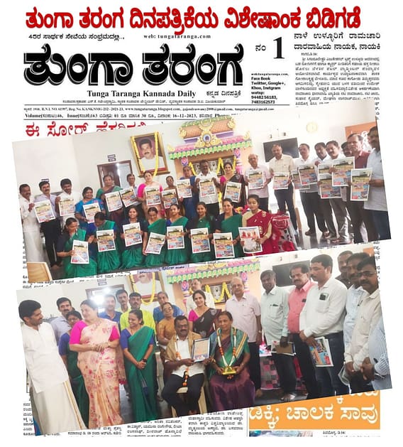 ಶಿವಮೊಗ್ಗ ಜಿಲ್ಲೆಯ ಹೆಸರಾಂತ ಪತ್ರಿಕೆಗಳಲ್ಲಿ ಒಂದಾದ “ತುಂಗಾ ತರಂಗ” ದಿನಪತ್ರಿಕೆಯ ವಾರ್ಷಿಕ ವಿಶೇಷಾಂಕ ತುಂಗೆಯ ವರುಣಾಂತರಂಗವನ್ನು ಇಂದು ಬೆಳಗ್ಗೆ ಗೋಪಾಳದ ರಾಮಕೃಷ್ಣ ವಿದ್ಯಾನಿಕೇತನದ ಸಭಾಂಗಣಲ್ಲಿ ನಡೆದ ಸರಳ ಸುಂದರ ಕಾರ್ಯಕ್ರಮದಲ್ಲಿ ಮಾತೆ ಯರು ವಿಶೇಷಾಂಕವನ್ನು ಬಿಡುಗಡೆ ಮಾಡಿ ಶುಭಕೊರಿದರು.