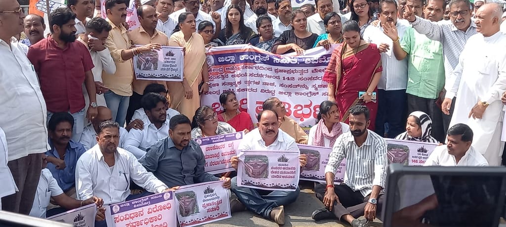 142 ಸಂಸದರನ್ನು ಅಮಾನತುಗೊಳಿಸಿ ಪ್ರಜಾಪ್ರಭುತ್ವದ ಕಗ್ಗೊಲೆ ಮಾಡಿ ಸಂಸತ್ತನ್ನು ಸ್ಮಶಾನವನ್ನಾಗಿ ಮಾಡಿರುವ ಬಿ.ಜೆ.ಪಿ. ಕೇಂದ್ರ ಸರ್ಕಾರದ ವಿರುದ್ಧ ಜಿಲ್ಲಾ ಕಾಂಗ್ರೆಸ್ ಸಮಿತಿಯ ಅಧ್ಯಕ್ಷರಾದ ಹೆಚ್. ಎಸ್. ಸುಂದರೇಶ್ ಅವರು ನೇತೃತ್ವ ದಲ್ಲಿ ಮಾಜಿ ಸಂಸದರಾದ
