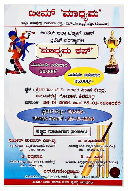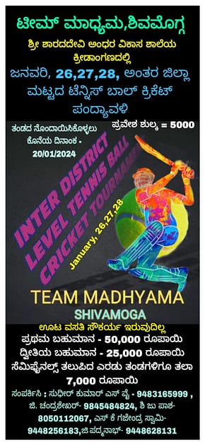 ಶಿವಮೊಗ್ಗ: ಶಿವಮೊಗ್ಗ ನಗರ ಟೀಮ್ ಮಾಧ್ಯಮ ಇವರ ಆಶ್ರಯದಲ್ಲಿ ಜನವರಿ 26,27,28 ರಂದು ನಗರದ ಶ್ರೀ ಶಾರದದೇವಿ ಅಂಧರ ವಿಕಾಸ ಶಾಲೆಯ ಕ್ರೀಡಾಂಗಣದಲ್ಲಿ ಅಂತರ ಜಿಲ್ಲಾ ಮಟ್ಟದ ಕ್ರಿಕೆಟ್ ಪಂದ್ಯಾವಳಿಯನ್ನು ಆಯೋಜಿಸಲಾಗಿದೆ. ಈ ಪಂದ್ಯಾವಳಿಯಲ್ಲಿ ಕೆಲವು ಜಿಲ್ಲೆಯ ಶ್ರೇಷ್ಠ ಕ್ರಿಕೆಟ್ ತಂಡಗಳು ಮತ್ತು ಶ್ರೇಷ್ಠ ಆಟಗಾರರು ಭಾಗವಹಿಸಲಿದ್ದಾರೆ. ಈ ಪಂದ್ಯಾವಳಿಯಲ್ಲಿ ಪ್ರಥಮ ಸ್ಥಾನವನ್ನು ಪಡೆದಂತಹ ತಂಡಕ್ಕೆ 50.000 ಸಾವಿರ ನಗದು ಮತ್ತು ಅತ್ಯಾಕರ್ಷಕ ಟ್ರೋಪಿ,ಎರಡನೇ ಸ್ಥಾನವನ್ನು ಗಳಿಸಿದ ತಂಡಕ್ಕೆ 25.000 ಸಾವಿರ ನಗದು ಮತ್ತು ಅತ್ಯಾಕರ್ಷಕ ಟ್ರೋಫಿ ಹಾಗೂ ಸೆಮಿಫೈನಲ್ಸ್ ಹಂತದಲ್ಲಿ ಸೊತಂತಹ ಎರಡು ತಂಡಗಳಿಗೆ ತಲಾ 7,000 ಸಾವಿರ ನಗದು ಮತ್ತು ಟ್ರೋಫಿಯನ್ನು ನೀಡಲಾಗುತ್ತದೆ.ಪ್ರತಿಯೊಂದು ಪಂದ್ಯಕ್ಕೂ ಪಂದ್ಯದ ಪುರುಷೋತ್ತಮ ಪ್ರಶಸ್ತಿಯನ್ನು ನೀಡಲಾಗುವುದು ಇನ್ನುಳಿದಂತೆ ಈ ಪಂದ್ಯಾವಳಿಯಲ್ಲಿ ಸರಣಿಯ ಶ್ರೇಷ್ಠ ಆಟಗಾರನಿಗೆ ಮೂರು ಸಾವಿರ ನಗದು ಮತ್ತು ಆಕರ್ಷಕ ಟ್ರೋಫಿಯನ್ನು ನೀಡಲಾಗುವುದು ,ಶ್ರೇಷ್ಠ ಬ್ಯಾಟ್ಸ್ಮನ್, ಶ್ರೇಷ್ಠ ಬೌಲಿಂಗ್ ಮತ್ತು ಶ್ರೇಷ್ಠ ಕೀಪರ್ ಹಾಗೂ ಉತ್ತಮ ಫೀಲ್ಡರ್ ಪ್ರಶಸ್ತಿಯ ಜೊತೆಗೆ ಎರಡು ಸಾವಿರ ರೂಪಾಯಿ ನಗದಿನ ಜೋತೆಗೆ ಟ್ರೋಫಿಯನ್ನು ನೀಡಲಾಗುವುದು,