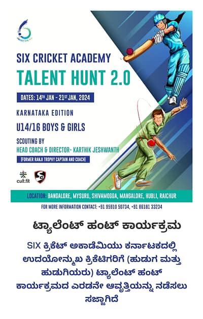 SIX ಕ್ರಿಕೆಟ್ ಅಕಾಡೆಮಿಯು ಕರ್ನಾಟಕದಲ್ಲಿ ಉದಯೋನ್ಮುಖ ಕ್ರಿಕೆಟ್ (14 ರಿಂದ 16 ವರ್ಷ ವಯಸ್ಸಿನ ಹುಡುಗ ಮತ್ತು ಹುಡುಗಿಯರು) ಆಟಗಾರರನ್ನು ಆಯ್ಕೆ ಮಾಡಲು ಟ್ಯಾಲೆಂಟ್ ಹಂಟ್ ಕಾರ್ಯಕ್ರಮದ ಎರಡನೇ ಆವೃತ್ತಿಯನ್ನು ನಡೆಸಲು ಸಜ್ಜಾಗಿದೆ