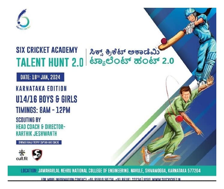ಉದಯೋನ್ಮುಖ ಕ್ರಿಕೆಟಿಗರಿಗಾಗಿ (ಬಾಲಕ ಮತ್ತು ಬಾಲಕಿಯರು) ಪ್ರತಿಭಾನ್ವೇಷಣೆ ಕಾರ್ಯಕ್ರಮದ ಎರಡನೇ ಆವೃತ್ತಿಯನ್ನು ಕರ್ನಾಟಕದಲ್ಲಿ ನಡೆಸಲು ಸಿಕ್ಸ್ ಕ್ರಿಕೆಟ್ ಅಕಾಡೆಮಿ ಸಜ್ಜಾಗಿದೆ. 2024ರ ಜನವರಿ 14 ರಿಂದ 21 ರವರೆಗೆ ಕರ್ನಾಟಕದ ಪ್ರತಿಷ್ಠಿತ ಆರು ನಗರಗಳಲ್ಲಿ ಮೊದಲ ಹಂತದ ಆಯ್ಕೆ ನಡೆಯಲಿದ್ದು, ಸಿಕ್ಸ್ ಕ್ರಿಕೆಟ್ ಅಕಾಡೆಮಿಯ ಮುಖ್ಯ ಕೋಚ್ ಮತ್ತು ನಿರ್ದೇಶಕ ಹಾಗೂ ಕರ್ನಾಟಕ ರಣಜಿ ತಂಡದ ಮಾಜಿ ನಾಯಕ ಮತ್ತು ತರಬೇತುದಾರ ಕಾರ್ತಿಕ್ ಜೆಶ್ವಂತ್ ಅವರು ಪ್ರತಿಭಾನ್ವೇಷಣೆ ನಡೆಸಲಿದ್ದಾರೆ.