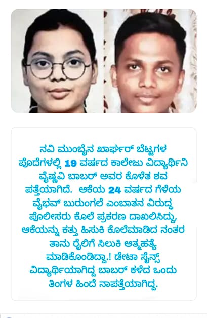 ವೈಷ್ಣವಿ ಬಾಬರ್ ಡಿಸೆಂಬರ್ 12 ರಂದು ಸಿಯೋನ್ನಲ್ಲಿರುವ ತನ್ನ ಕಾಲೇಜಿಗೆ ಹೋಗಿದ್ದರು. ಕಾಲೇಜಿಗೆ ಹೋದ ಯುವತಿ ಮನೆಗೆ ಹಿಂತದಿರುಗಲಿಲ್ಲ.! ನಂತರ ಆಕೆಯ ತಾಯಿ ಅದೇ ದಿನ ಕಳಂಬೋಲಿ ಪೊಲೀಸ್ ಠಾಣೆಯಲ್ಲಿ ಮಗಳು ಕಾಣೆಯಾದ ಬಗ್ಗೆ ದೂರು ದಾಖಲಿಸಿದ್ದರು. ಅದೇ ದಿನ ವೈಭವ್ ಬುರುಂಗಲೆ ಎನ್ನುವ ವ್ಯಕ್ತಿಯ ದೇಹವು ರೈಲ್ವೆ ಟ್ರ್ಯಾಕ್ನಲ್ಲಿ ಪತ್ತೆಯಾಗಿತ್ತು.! ಜುಯಿನಗರ ನಿಲ್ದಾಣದ ರೈಲ್ವೆ ಹಳಿಯಲ್ಲಿ ಈತನ ಶವ ಪತ್ತೆಯಾಗಿತ್ತು ಎಂದು ಪೊಲೀಸರು ತಿಳಿಸಿದ್ದಾರೆ. ತಕ್ಷಣವೇ ಈತನ ಸಾವಿನ ಕುರಿತು ಪ್ರಕರಣ ದಾಖಲಿಸಿಕೊಂಡ ಪೋಲಿಸರು ತನಿಖೆಗೆ ಮುಂದಾಗಿದ್ದಾರೆ.ಪೋಲಿಸರ ವಿಶೇಷ ಕಾರ್ಯಪಡೆಯನ್ನು ರಚನೆ ಮಾಡಲಾಗಿತ್ತು. ಈ ಹಂತದಲ್ಲಿ ವೈಭವ್ನ ಮೊಬೈಲ್ನಲ್ಲಿ ತಾನು ಪ್ರೀತಿಸಿದ ಯುವತಿ ವೈಷ್ಣವಿಯನ್ನು ಕೊಲೆ ಮಾಡಿ ಆತ್ಮಹತ್ಯೆ ಮಾಡಿಕೊಳ್ಳಲು ಹೊರಟಿರುವುದಾಗಿ ಬರೆದಿರುವ ಸೂಸೈಡ್ ನೋಟ್ಅನ್ನು ಪೊಲೀಸರು ಪತ್ತೆ ಮಾಡಿದ್ದರು.!