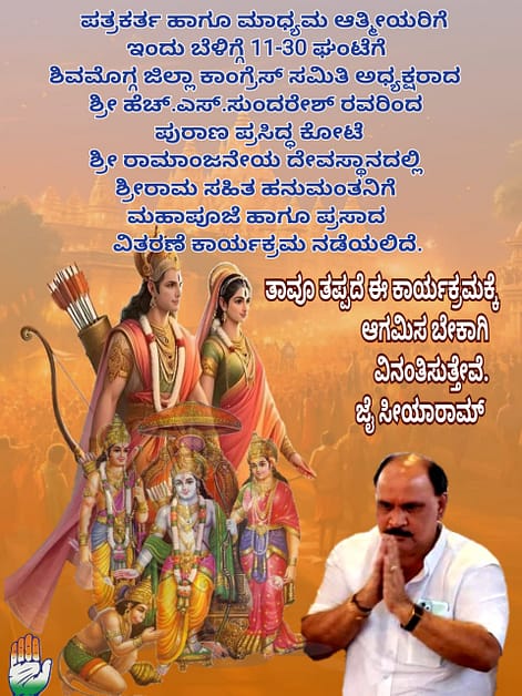 ಅವರು ಇಂದು ಜಿಲ್ಲಾ ಕಾಂಗ್ರೆಸ್ ವತಿಯಿಂದ ಶಿವಮೊಗ್ಗ ನಗರದ ಪುರಾಣಪ್ರಸಿದ್ಧ ಕೋಟೆ ಶ್ರೀ ಸೀತಾ ರಾಮ ಆಂಜನೇಯ ದೇವಸ್ಥಾನದಲ್ಲಿ ಶ್ರೀರಾಮನ ಸಹಿತ ಆಂಜನೇಯನಿಗೆ ಮಹಾ ಪೂಜೆ ನೆರವೇರಿಸಿ ನಂತರ ಸುದ್ದಿಗಾರರೊಂದಿಗೆ ಮಾತನಾಡಿದರು.