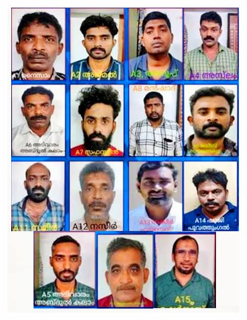 ಪಾಪ್ಯುಲರ್ ಫ್ರಂಟ್ ಕಾರ್ಯಕರ್ತರಾದ ನಿಸಾಮ್, ಅಜ್ಮಲ್, ಅನೂಪ್, ಮುಹಮ್ಮದ್ ಅಸ್ಲಂ, ಮಣ್ಣಂಜೇರಿ ಞರವೇಲಿ ಅಬ್ದುಲ್ ಕಲಾಂ ಅಲಿಯಾಸ್ ಸಲಾಂ, ಅಬ್ದುಲ್ ಕಲಾಂ, ಸರಫುದ್ದೀನ್, ಮನ್ಷಾದ್, ಜಸೀಬ್ ರಾಜ, ನವಾಸ್, ಸಮೀರ್, ನಸೀರ್, ಝಕೀರ್ ಹುಸೈನ್, ಷಾಜಿ, ಶೆರ್ನಾಝ್ ಅಶ್ರಫ್ ಆರೋಪಿಗಳು. 10ನೇ ಆರೋಪಿ ನವಾಜ್ ಅನಾರೋಗ್ಯದಿಂದ ಬಳಲುತ್ತಿದ್ದು, ತಿರುವನಂತಪುರಂ ವೈದ್ಯಕೀಯ ಕಾಲೇಜು ಆಸ್ಪತ್ರೆಯಲ್ಲಿ ಚಿಕಿತ್ಸೆ ಪಡೆಯುತ್ತಿದ್ದಾನೆ.