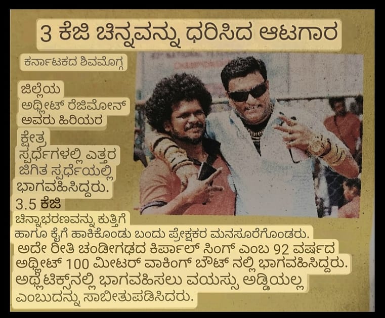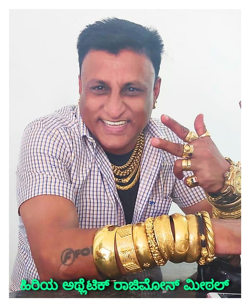 3 ಕೆಜಿ ಚಿನ್ನವನ್ನು ಮೈಮೇಲೆ ಧರಿಸಿರುವ ಅಥ್ಲೆಟಿಕ್ಸ್ ಶಿವಮೊಗ್ಗದ ರಾಜಿಮೋನ್ ಮೀಠಲ್!!