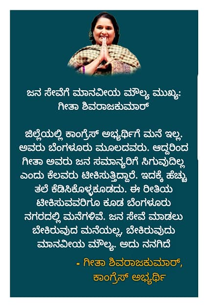 ರಾಜ್ಯ ಸರ್ಕಾರದ ಐದು ಗ್ಯಾರಂಟಿ ಯೋಜನೆಗಳು ಮಧ್ಯವರ್ತಿಗಳ ಕಾಲ್ತುಳಿತಕ್ಕೆ ಸಿಲುಕದೆ, ನೇರವಾಗಿ ಬಡವರ ಕೈ ಸೇರುತ್ತಿವೆ ಎಂದು ಕಾಂಗ್ರೆಸ್ ಅಭ್ಯರ್ಥಿ ಗೀತಾ ಶಿವರಾಜಕುಮಾರ್ ಹೇಳಿದರು.