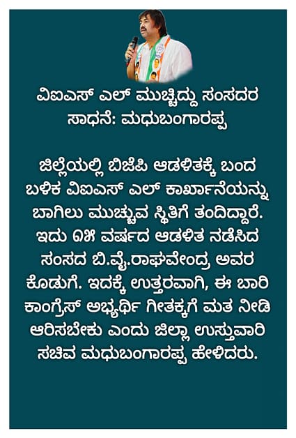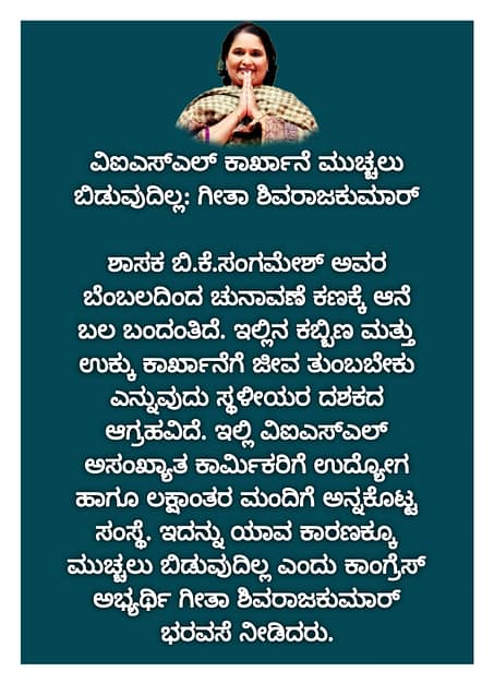 ಮಾಜಿ ಮುಖ್ಯಮಂತ್ರಿ ಬಂಗಾರಪ್ಪ ಅವರು ರೈತರ ಕೃಷಿ ಪಂಪ್ ಸೆಟ್ ಗಳಿಗೆ ಉಚಿತ ವಿದ್ಯುತ್ ನೀಡುವ ಮೂಲಕ, ಸಾಮಾನ್ಯ ಜನರು ಉಸಿರಾಡುಂತಹ ವಾತಾವರಣ ಸೃಷ್ಟಿಸಿ ಹೋಗಿದ್ದಾರೆ. ಅದರ ಋಣ ತೀರಿಸಲು ಕಾಂಗ್ರೆಸ್ ಅಭ್ಯರ್ಥಿ ಗೀತಾ ಶಿವರಾಜಕುಮಾರ್ ಅವರಿಗೆ ಮತ ನೀಡಿ ಆಶೀರ್ವದಿಸಬೇಕು ಎಂದು ಕೋರಿದರು.