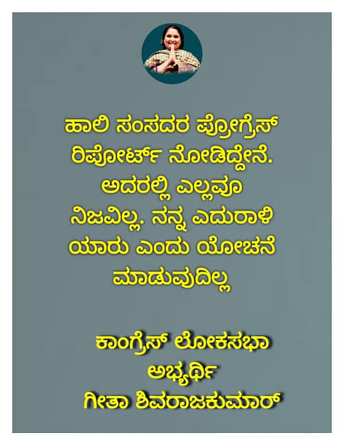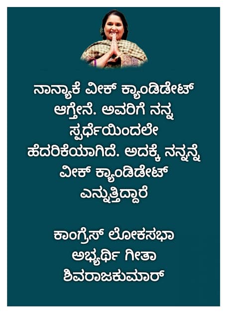 ನಾನ್ಯಾಕೆ ವೀಕ್ ಕ್ಯಾಂಡಿಡೇಟ್ ಆಗ್ತೇನೆ. ಅವರಿಗೆ ನನ್ನ ಸ್ಪರ್ಧೆಯಿಂದಲೇ ಹೆದರಿಕೆಯಾಗಿದೆ. ಅದಕ್ಕೆ ನನ್ನನ್ನೆ ವೀಕ್ ಕ್ಯಾಂಡಿಡೇಟ್ ಎನ್ನುತ್ತಿದ್ದಾರೆ ; ಕಾಂಗ್ರೆಸ್ ಲೋಕಸಭಾ ಅಭ್ಯರ್ಥಿ ಗೀತಾ ಶಿವರಾಜಕುಮಾರ್