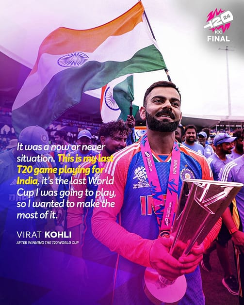 ಅದ್ಭುತ ಆಟವಾಡಿ 76 ರನ್ ಗಳಿಸಿ ಜೋತೆಗೆ ವಿಶ್ವಕಪ್ ಗೆದ್ದನಂತರ ವಿರಾಟ್ ಕೊಯ್ಲಿ ʼಮ್ಯಾನ್ ಆಫ್ ದಿ ಮ್ಯಾಚ್ʼ ಪ್ರಶಸ್ತಿ ಪಡೆದು ಮಾತನಾಡಿದರು. ಮಾತಿನ ನಡುವೆಯೇ ಭಾರತ ತಂಡದ ಸ್ಟಾರ್ ಬ್ಯಾಟರ್ ವಿರಾಟ್ ಕೊಹ್ಲಿ ತಮ್ಮ ಅಂತರಾಷ್ಟ್ರೀಯ ಟಿ20 ಕ್ರಿಕಟ್ ಗೆ ನಿವೃತ್ತಿ ನೀಡುವುದಾಗಿ ಘೋಷಣೆ ಮಾಡಿದರು.!