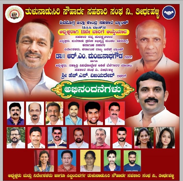 ಡಿಸಿಸಿ ಬ್ಯಾಂಕ್ ಅಧ್ಯಕ್ಷರಾಗಿ 11ನೇ ಬಾರಿಗೆ ಆಯ್ಕೆಯಾದ ಆರ್ ಎಂ ಮಂಜುನಾಥ್ ಗೌಡ ಮತ್ತು ಸದಸ್ಯರಾಗಿ ಆಯ್ಕೆಯಾಗಿರುವ ಹೆಚ್ ಎನ್ ವಿಜಯದೇವ್ ಅವರಿಗೆ ಅಭಿನಂದನೆ : ಅಧ್ಯಕ್ಷರು , ಉಪಾಧ್ಯಕ್ಷರು ಮತ್ತು ಸರ್ವ ಸದಸ್ಯರು, ತುಳುನಾಡುಸಿರಿ ಸಹಕಾರಿ ಸಂಘ ನಿ, ತೀರ್ಥಹಳ್ಳಿ
